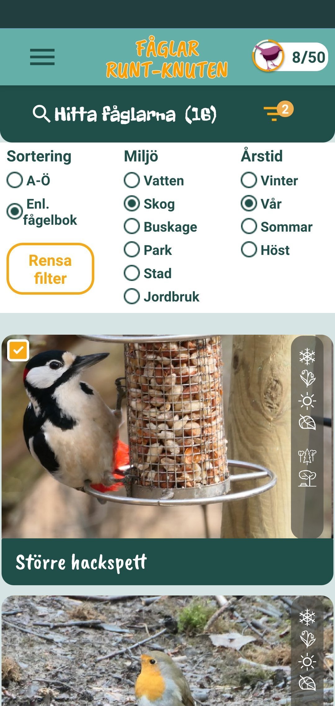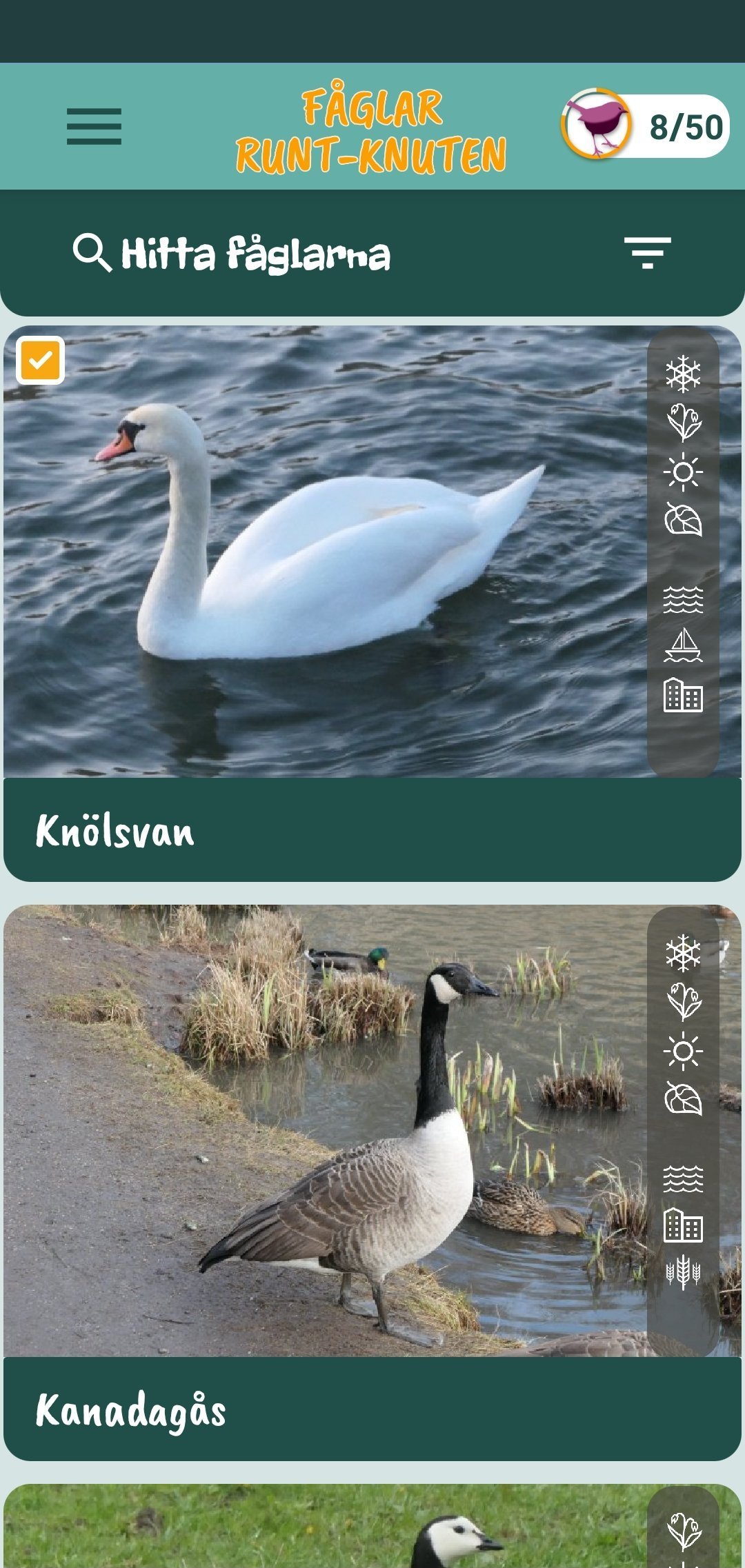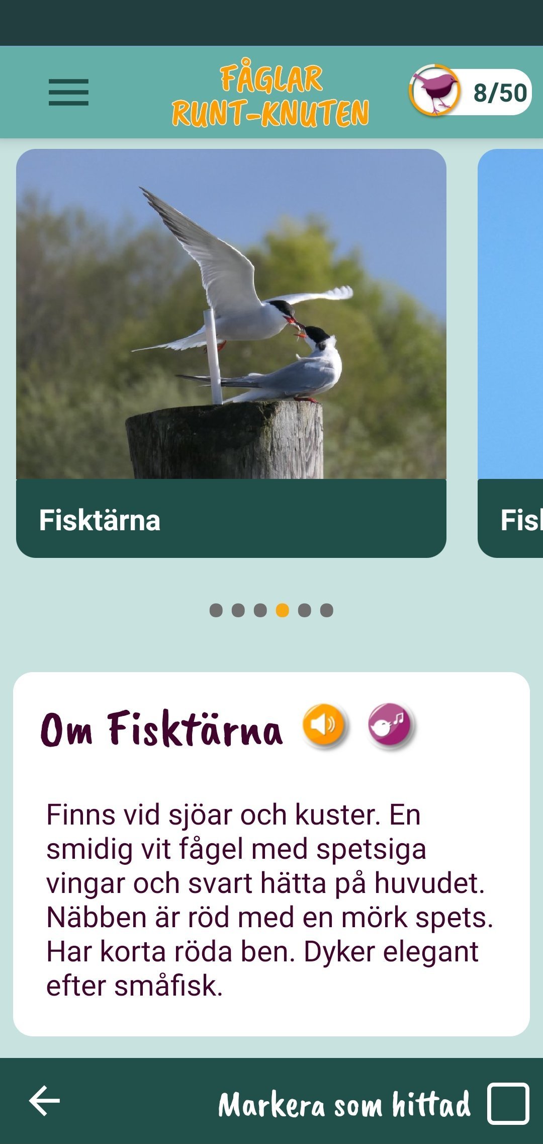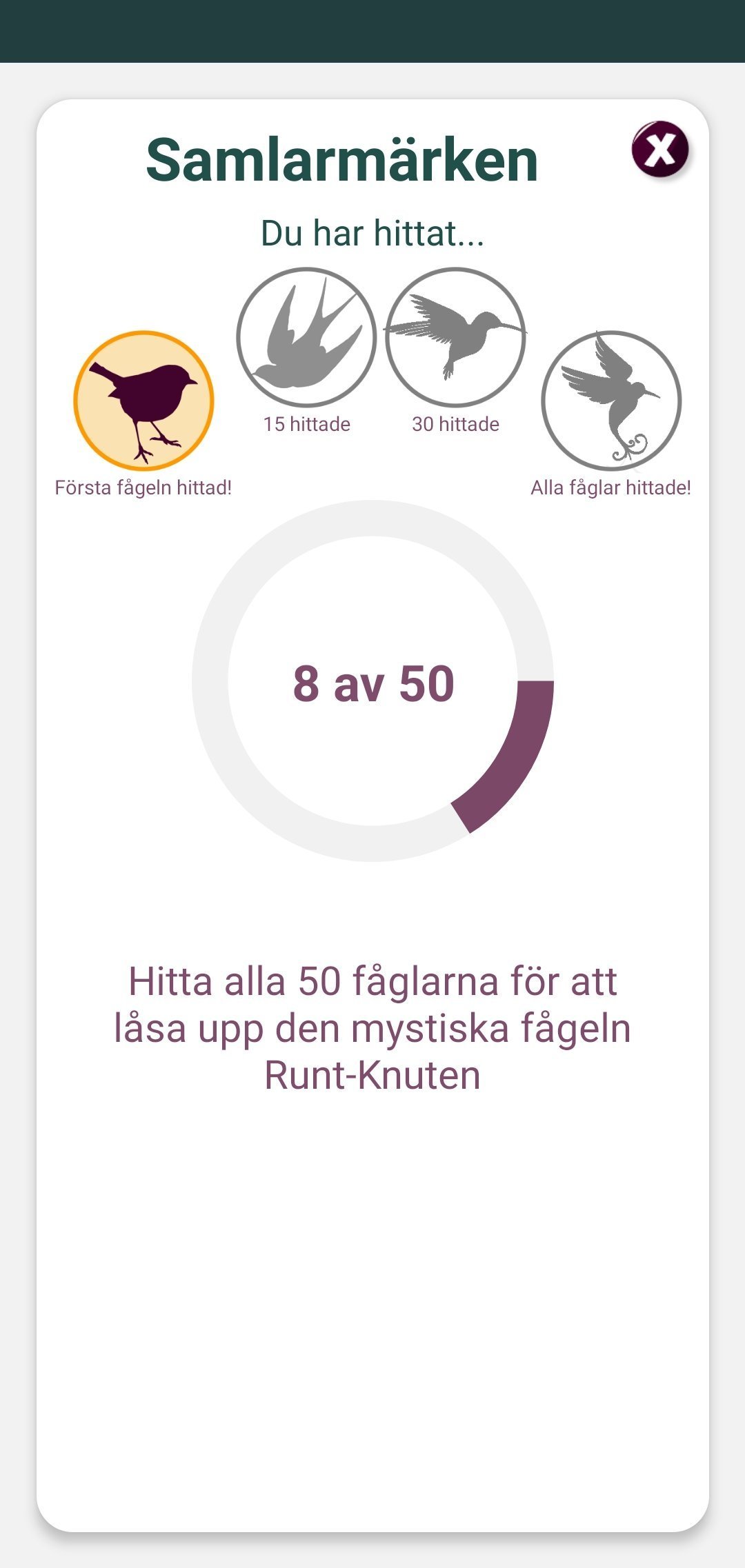 När gruppen är hemma igen kan ni starta appen och gå igenom de fåglar som blev markerade som hittade och försöka minnas vad ni såg och var observationen gjordes.